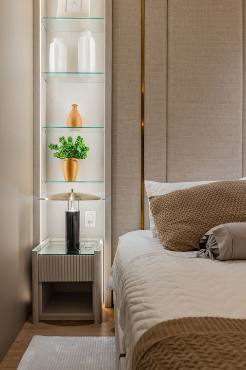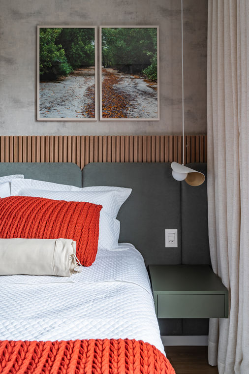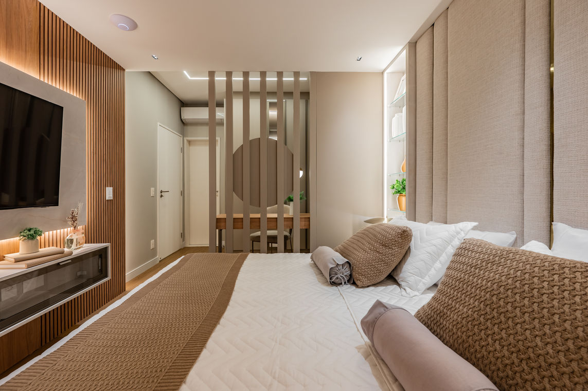 Na suíte, projetamos um mini closet com penteadeira e conseguimos acomodar uma cama Queen, evidenciando a amplitude do ambiente. Apostamos em texturas sofisticadas, utilizando materiais variados, cortinas diferenciadas, cores suaves e a presença marcante da madeira, garantindo aconchego e elegância.