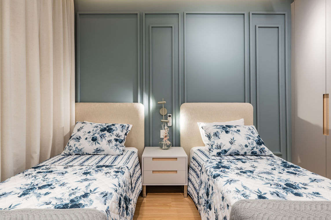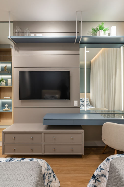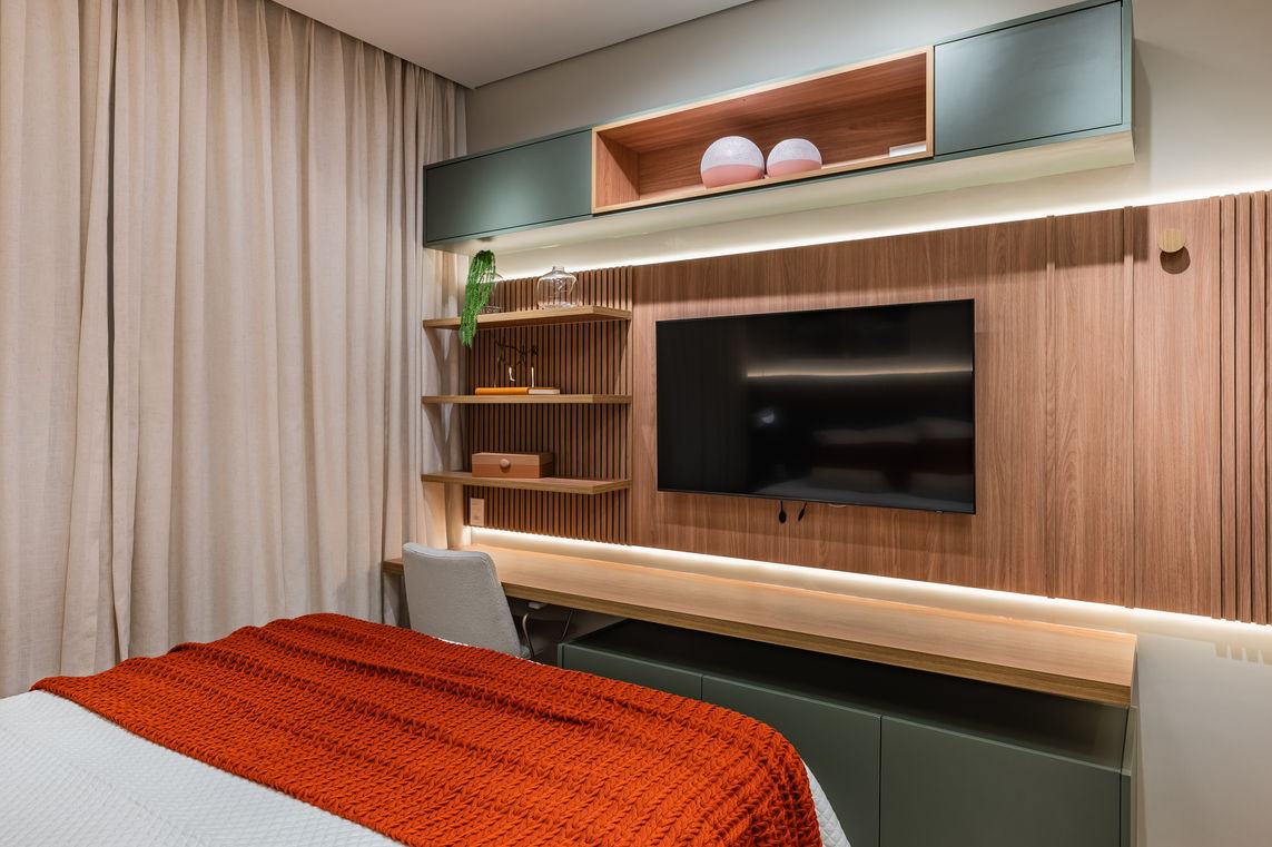 O quarto de hóspedes ganhou personalidade com uma paleta que combina verde, laranja e tons quentes de madeira, mantendo, ao mesmo tempo, uma atmosfera neutra e acolhedora. Já o quarto infantil foi planejado em tons de azul, mas com um design versátil, adequado tanto para meninos quanto para meninas. O espaço conta com penteadeira, área de estudos, televisão e todos os elementos essenciais para conforto e funcionalidade.