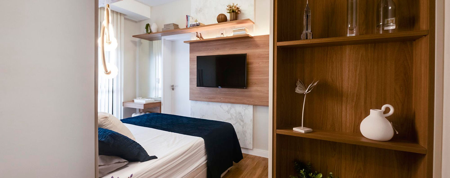 Já o quarto do casal recebeu 2 lances de armários para aproveitar ao máximo o espaço, uma penteadeira de maquiagem e um painel de tv estiloso.